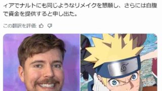 嫌儲世界一のYouTuber、ミスタービースト「NARUTOアニメを1話からリメイクしてくれ!!!金なら俺が出す!!」