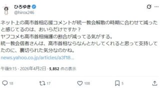 嫌儲ひろゆき「ネット上の高市首相応援コメントが統一教会解散の時期に合わせて減ったと感じてるのは、おいらだけですか?」