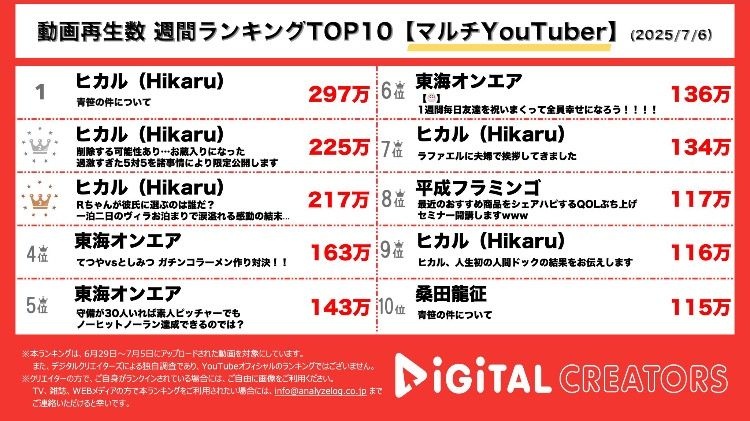 ロング動画じゃもうヒカルに勝てるやついねぇだろ、東海オンエアみたいに登録者と再生数が比例していないパターンでもないから無敵すぎるわ