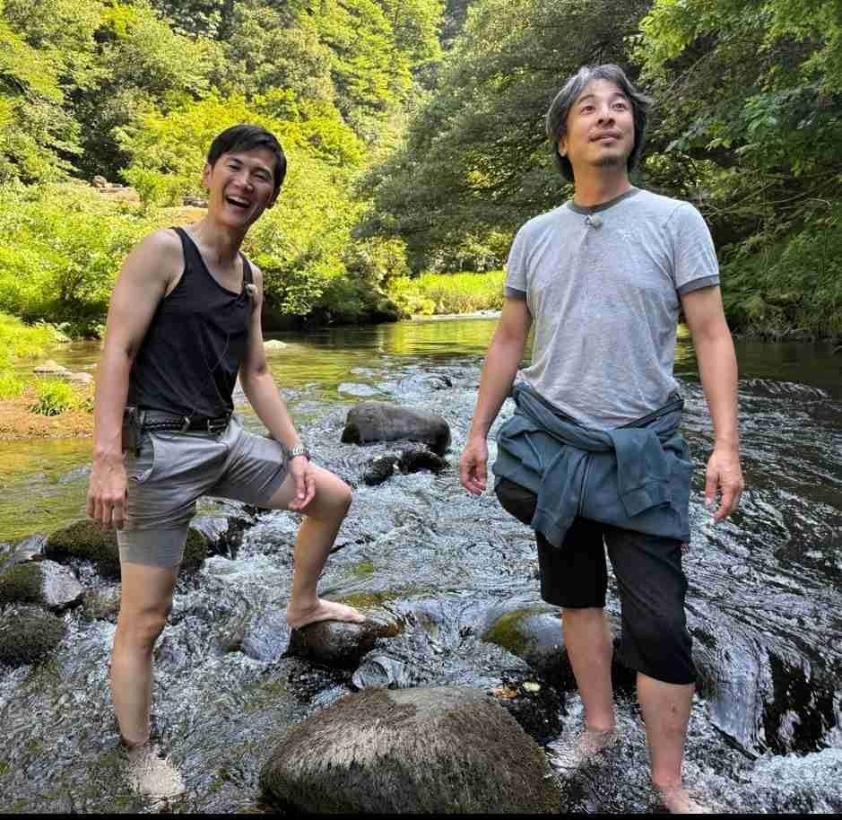 写真を投稿したのは経済メディア「ReHacQ」プロデューサー高橋弘樹氏。石丸氏は緑豊かな渓流に裸足で入り、グレーの半ズボン、黒のタンクトップ姿で笑顔を浮かべた。隣には「2ちゃんねる」開設者で元管理人「ひろゆき」こと西村博之氏がTシャツ姿で立っていた。