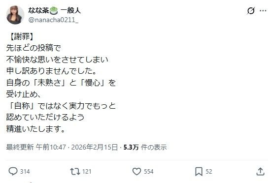 15日、「【謝罪】先ほどの投稿で 不愉快な思いをさせてしまい 申し訳ありませんでした。自身の『未熟さ』と『慢心』を受け止め、『自称』ではなく実力でもっと認めていただけるよう精進いたします」とポスト。当該ポストについて削除した。また、この日までにアカウント名は「なな茶 一般人」に変更されていた。