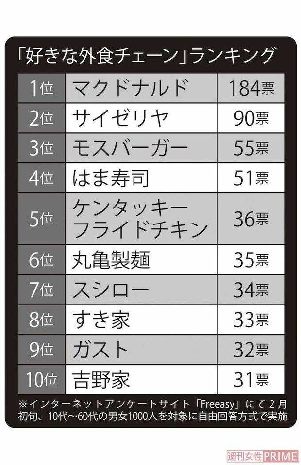 「好きな外食チェーン」ランキング ※インターネットアンケートサイト「Freeasy」にて2月初旬、10代?60代の男女1000人を対象に自由回答方式で実施