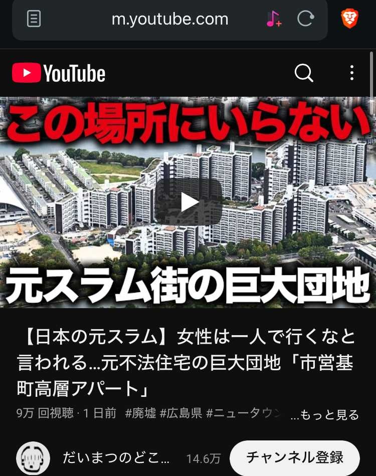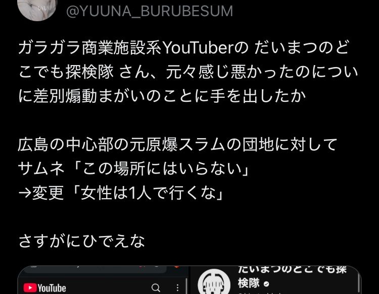 ガラガラ商業施設系YouTuberの だいまつのどこでも探検隊 さん、元々感じ悪かったのについに差別煽動まがいのことに手を出したか広島の中心部の元原爆スラムの団地に対して