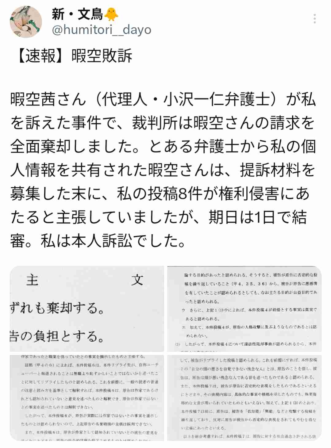 【暇空敗訴】暇空茜、過去最大級の敗訴!アンチ(弁護士なしの本人訴訟)を8件訴えるも、1日で全部棄却