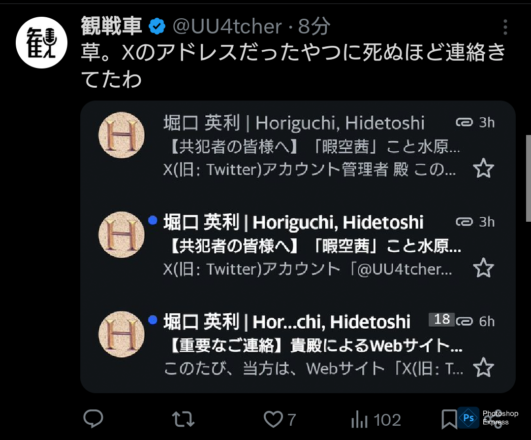 ツイの開示がパカってアカウント紐づけのメアドに堀口からおてまみ来たって話? - 108 : 2025/04/23(水) 01:02:29.97 ID:N8pGKV1S0