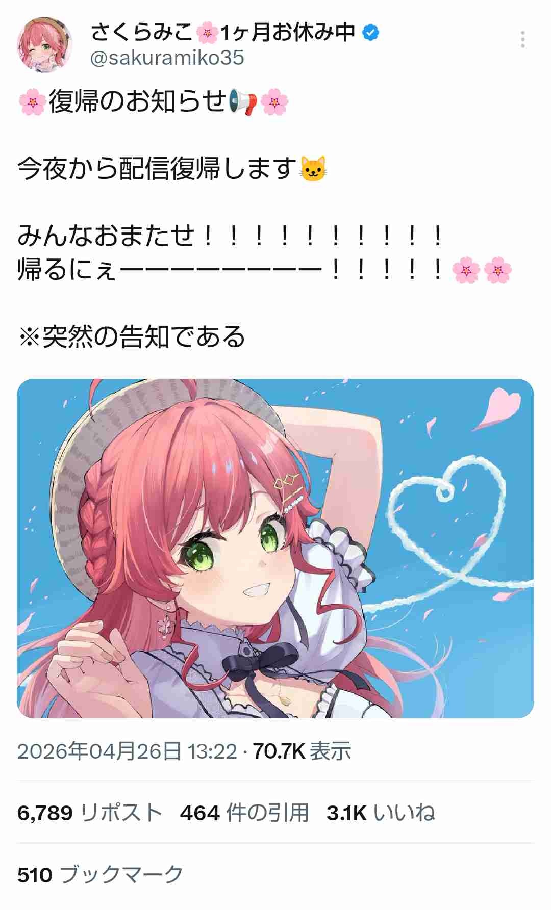 【高市朗報】ホロライブさくらみこさん、一ヶ月の休養から本日電撃復帰 嫌儲全体でみこちの復帰をお祝いしよう!