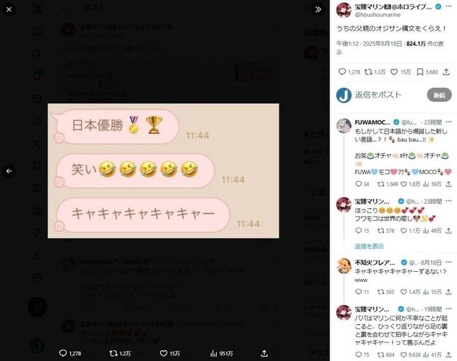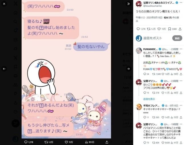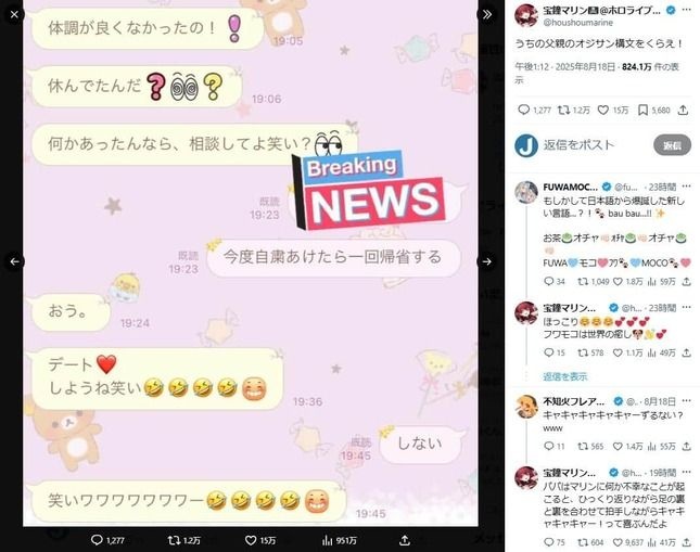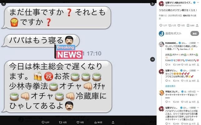 女性VTuberグループ「ホロライブ」所属の宝鐘マリンさんが2025年8月18日にXで、これまでに父から届いたという「オジサン構文」のメッセージを披露し、「面白すぎる」などと反響を呼んでいる。