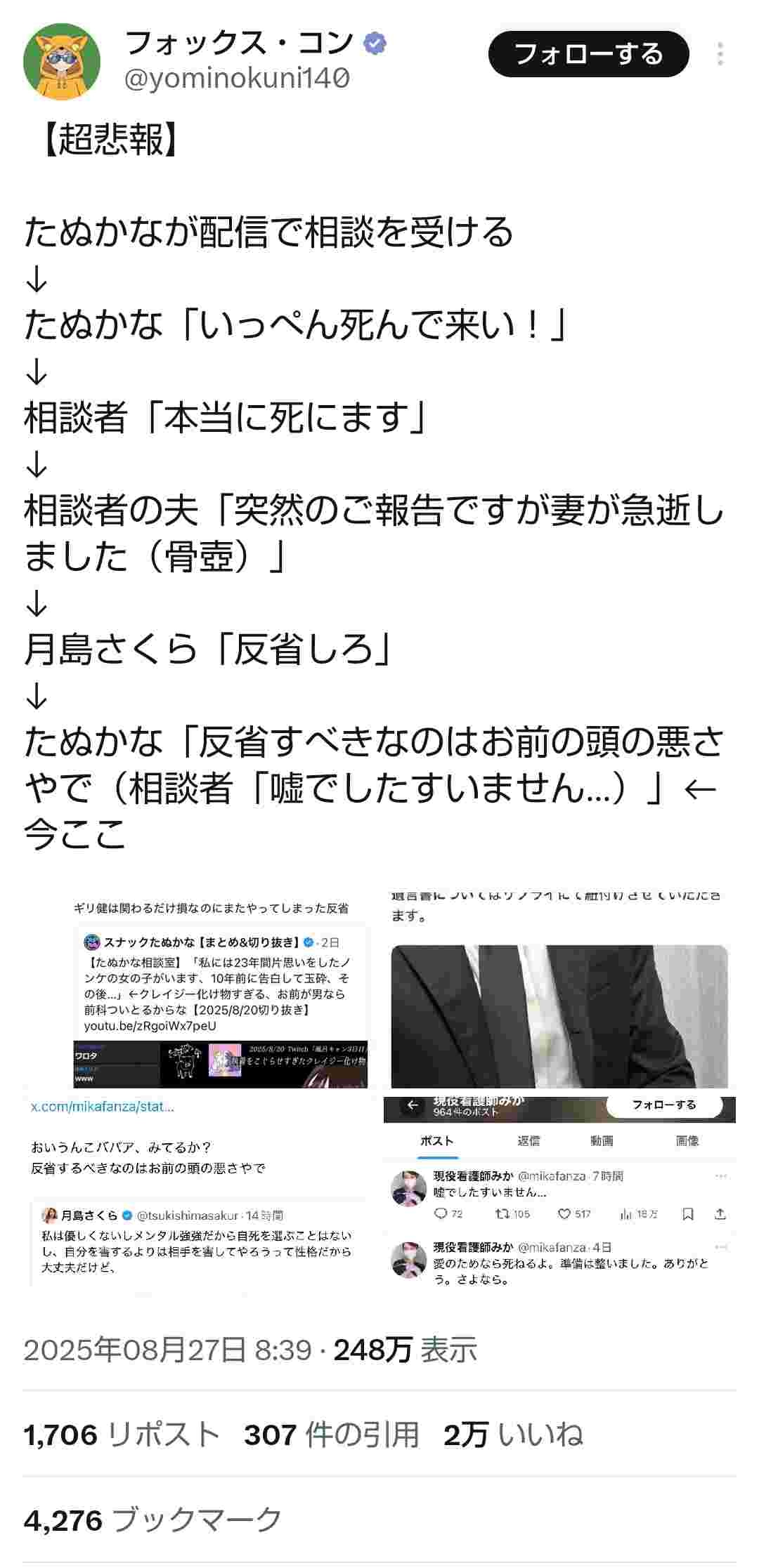 この件については知らないが、たぬかなが三上悠亜AVウェデイングドレス問題で月島とやりあったはず