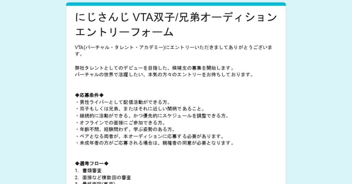 ・年齢不問、経験問わず、学ぶ姿勢のある方。 にじさんじ VTA双子/兄弟オーディション エントリーフォームVTA(バーチャル・タレント・アカデミー)にエントリーいただきましてありがとうございます。弊社タレントとしてのデビューを目指した、候補生の募集を開始します。バーチャルの世界で活躍したい、本気の方々のエントリーをお待ちしております。◆応募条件◆・男性ライバーとして配信活動ができる方。・双子もしくは兄弟、またはそれに近しい...docs.google.comにじさんじ VTAマスコットライバーオーディション