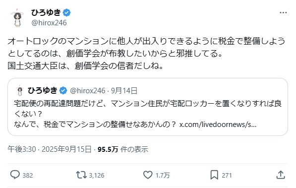 ひろゆき「オートロックのマンションに他人が出入りできるように税金で整備しようとしてるのは、創価学会が布教したいから」