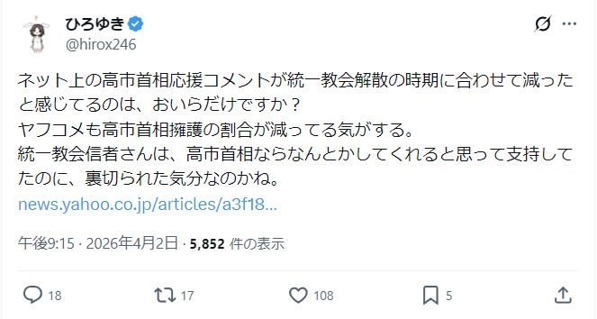 ヤフコメは反高市コメント増えてるし、そういうコメントにいいねの割合が増えてる印象はある