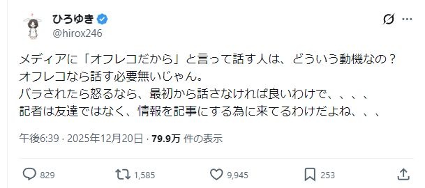 それはその通りなんだがオフレコを暴かれて失脚した人の大半は安全な遠くから石を投げるようなことを重ねて