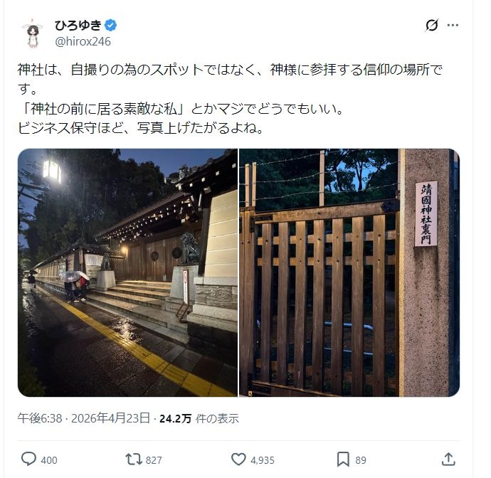 神社はまあ勝手にやればいいが安倍の国葬もどきで自撮り上げまくってたビジウヨ界隈にはマジで引いた
