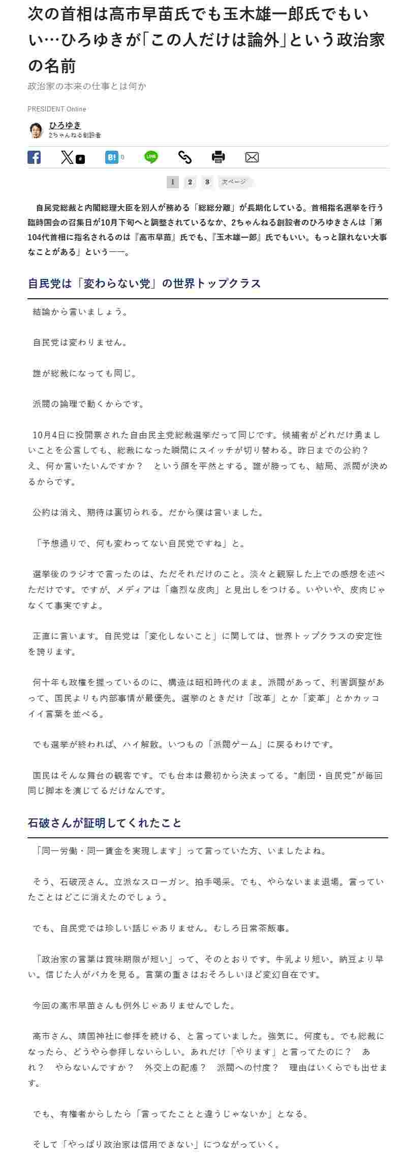 ひろゆき「誰が総理でもいい。高市氏でも玉木氏でも構わない。ただし石破氏だけは論外