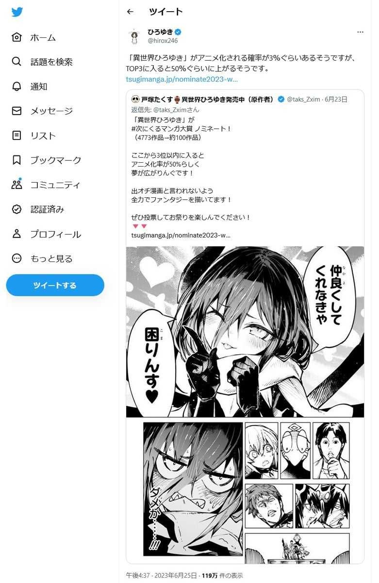 戸塚たくす先生「異世界ひろゆき、初週PVが100万超え達成!」「かなり凄い数字らしく編集長が驚いて叫んだとか。。。笑」