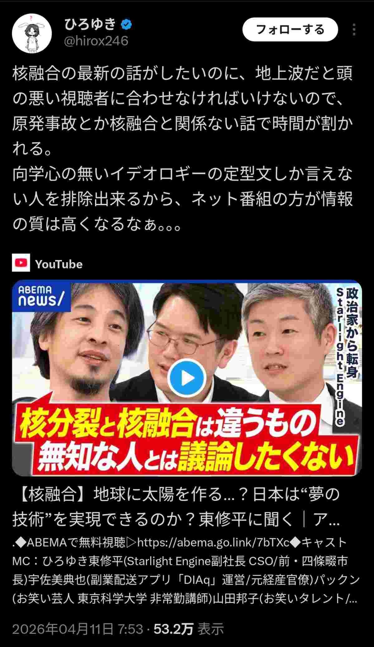 なんかひろゆきが核融合の話したいっていうだけで凄い怒る奴がいるのってなんなんやろ