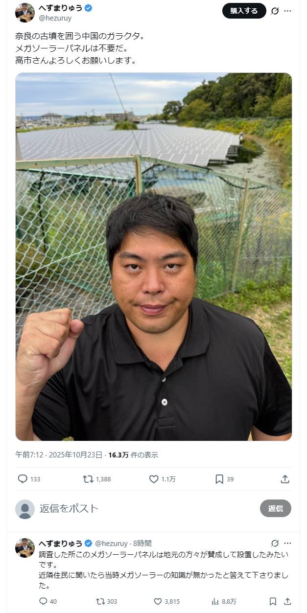 へずまりゅう「奈良の古墳を囲う中国のガラクタ。メガソーラーパネルは不要だ。高市さんよろしくお願いします。