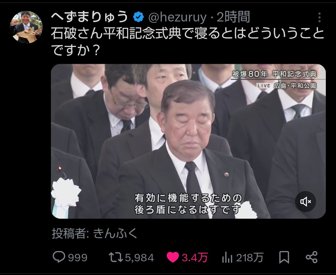 へずま氏は、一部ユーザーが投稿した、この日広島市の平和記念公園で営まれた原爆死没者慰霊式・平和祈念式の中継映像の一部を切り取ったポストを引用。この動画では石破氏が一時的に数秒間程度、目を閉じているように見える様子が映っており、同氏はその後眼を開けて顔をぱっと上げている。
