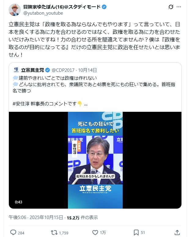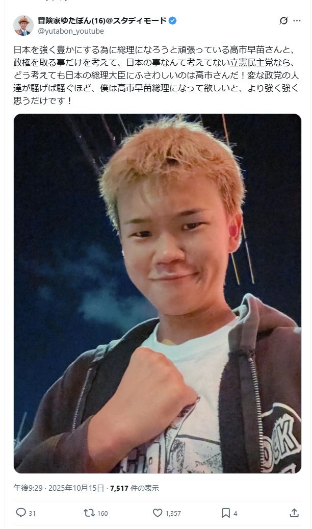 ゆたぼん「日本のために頑張っている高市早苗さんと、政権をとる事だけの立憲民主党なら総理大臣にふさわしいのは高市さん!