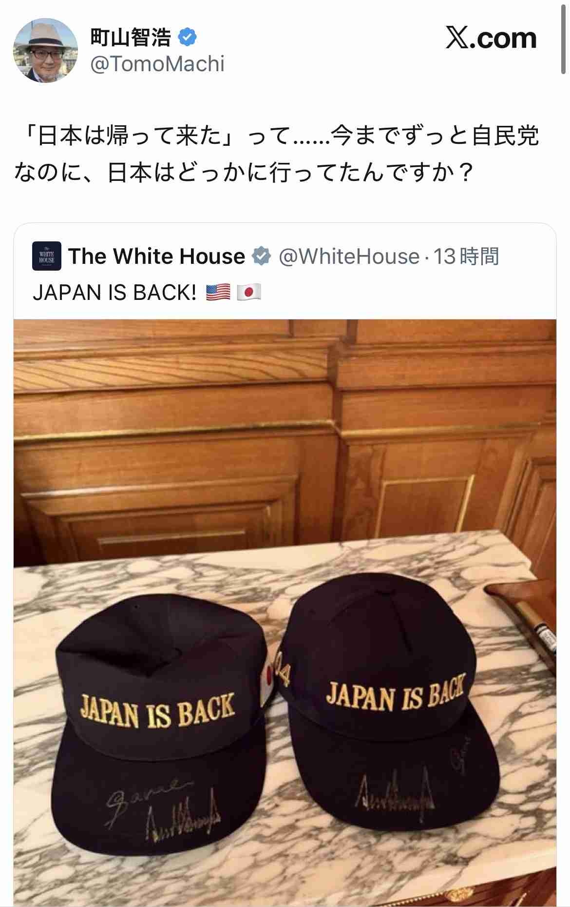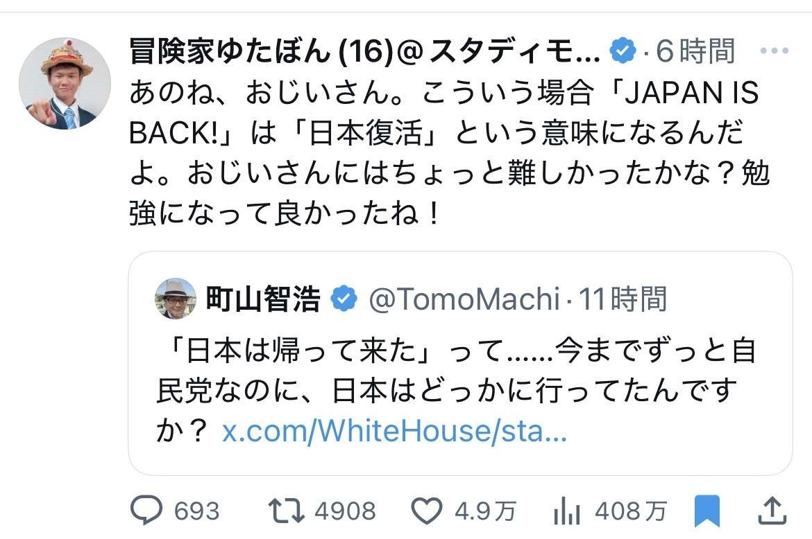 日本が戻った言っても謙虚なところを美徳とする日本人価値観からすると傲慢に感じられるはずなのでアメリカかぶれというか厚顔な恥知らずというか