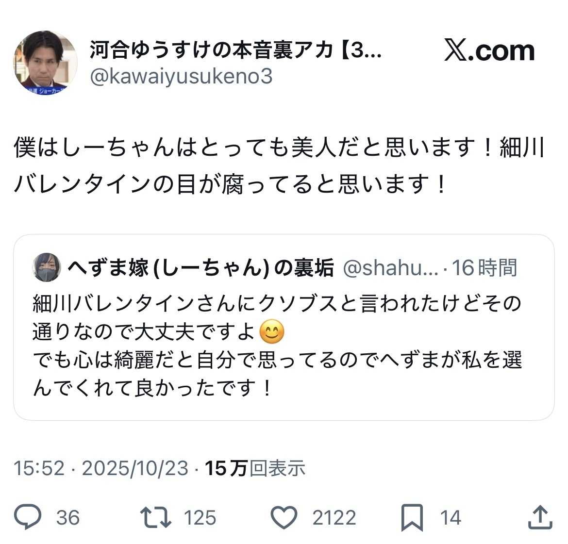 ウヨゲバ発生。細川バレンタインVSへずま嫁and河合ゆうすけのバトルが開始