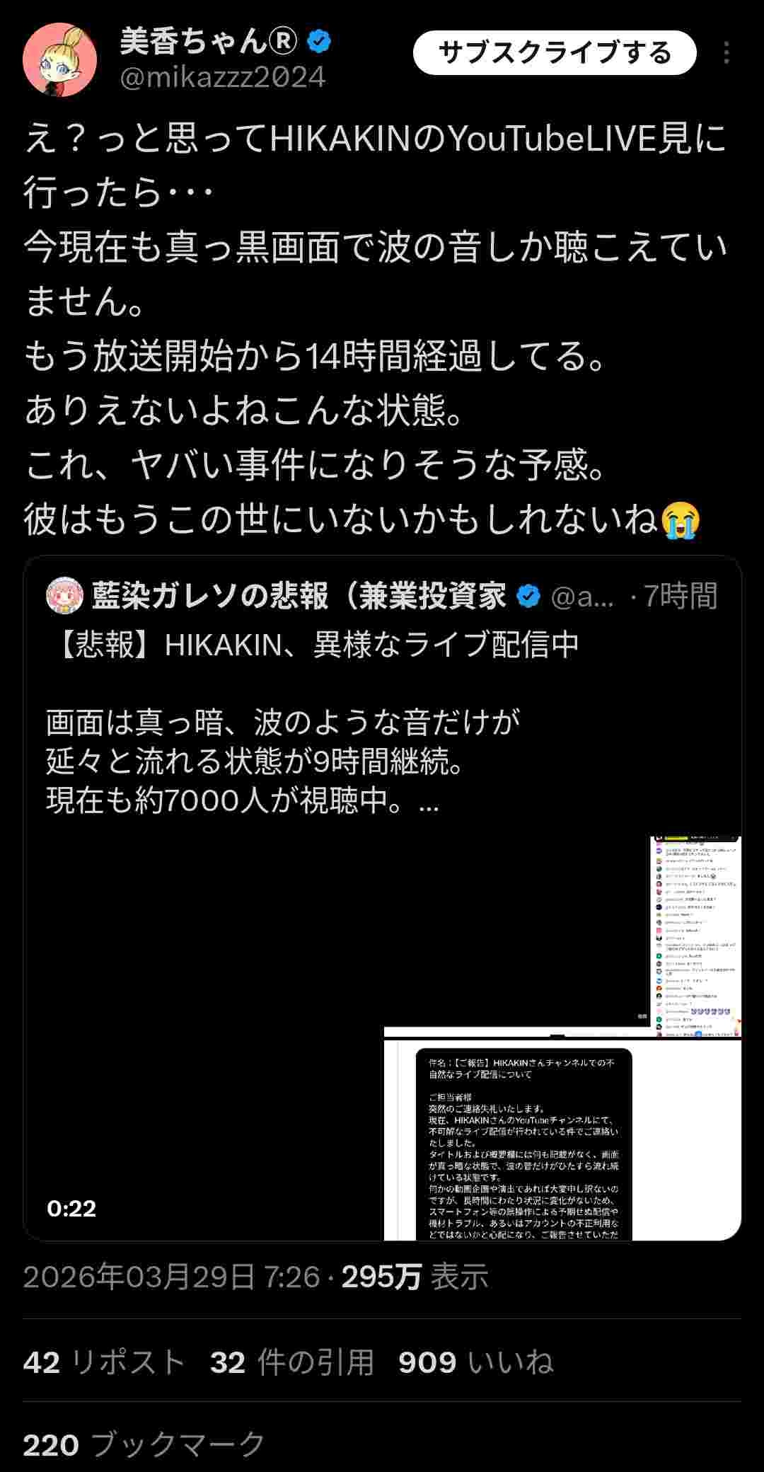 ヒカキン「画面真っ暗にして波の音だけライブで流すわw」→14時間経過しても7000人が視聴www