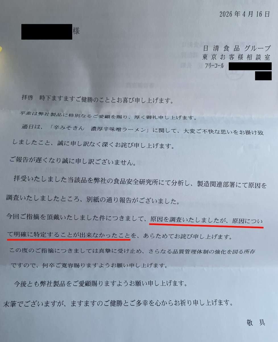 同じ4月16日付で日清食品グループ東京お客様相談室から送られた2通目の書面では、商品について大変不快な思いをかけたことへの謝罪に続き、「原因を調査いたしましたが、原因について明確に特定することが出来なかった」と報告。指摘を真摯に受け止めたうえで品質管理体制のさらなる強化を図るとつづられていました。