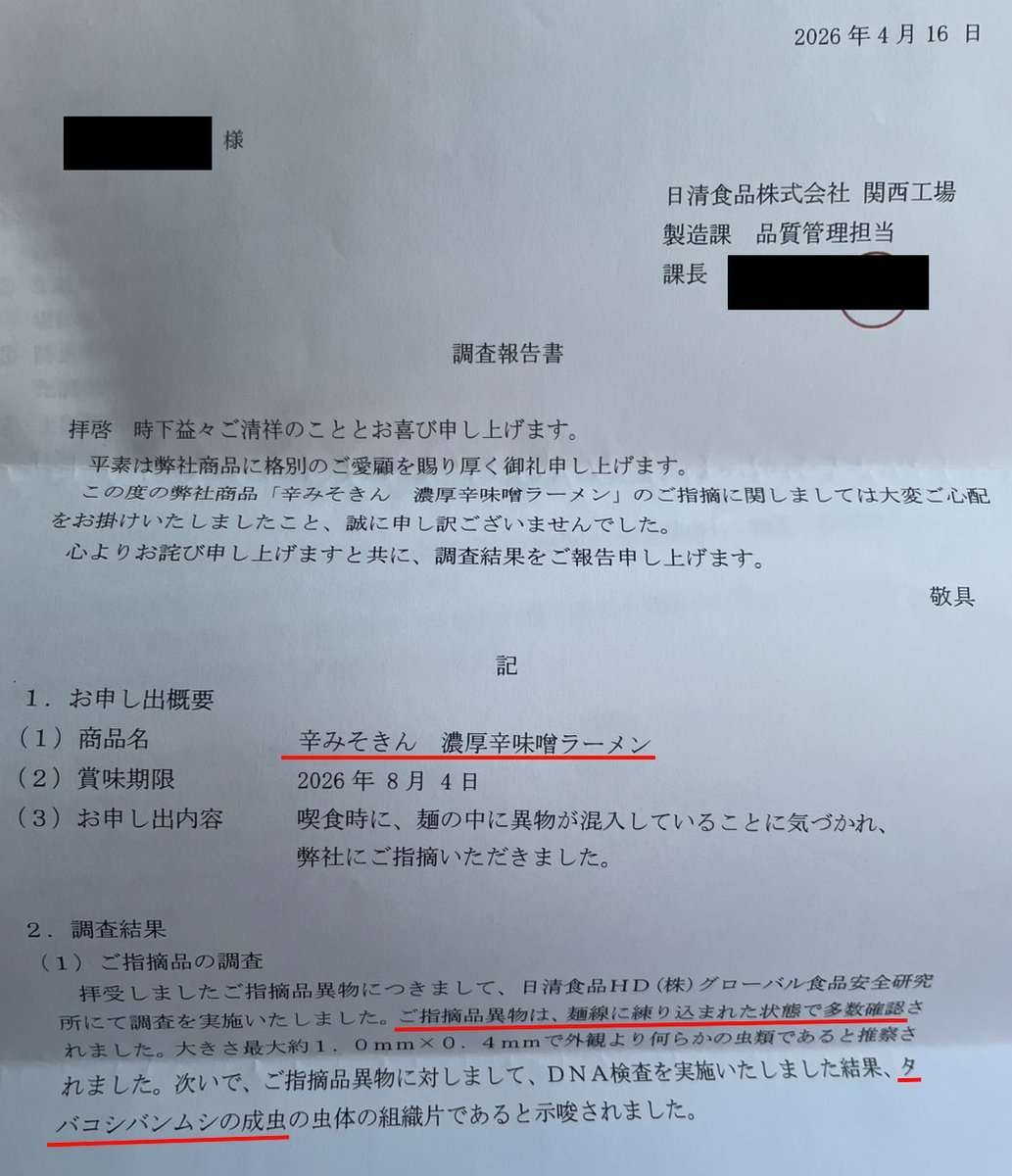 日清食品株式会社関西工場 製造課 品質管理担当から4月16日付で送られた調査報告書には、賞味期限2026年8月4日の「辛みそきん 濃厚辛味噌ラーメン」を喫食した際、麺の中に異物が混入していることに気づいたという女性の申し出に対し、日清食品HD株式会社グローバル食品安全研究所で調査を実施したと説明。その結果、「ご指摘品異物は、麺線に練り込まれた状態で多数確認されました」とし、大きさは最大で約1.0mm×0.4mm、外観から何らかの虫類であると推察されたと記されています。さらにDNA検査の結果、「タバコシバンムシの成虫の虫体の組織片であると示唆されました」との所見も明記されていました。