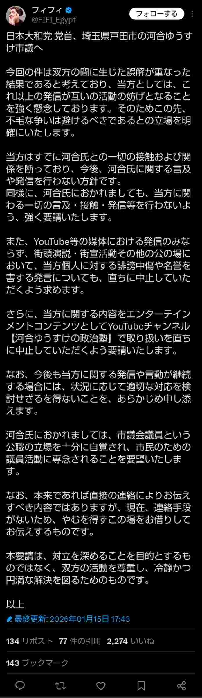 フィフィ、河合ゆうすけ市議に長文お気持ち表明