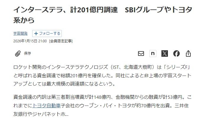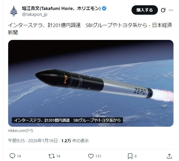 ホリエモンロケット、インターステラ、計201億円調達 SBIグループやトヨタ系から