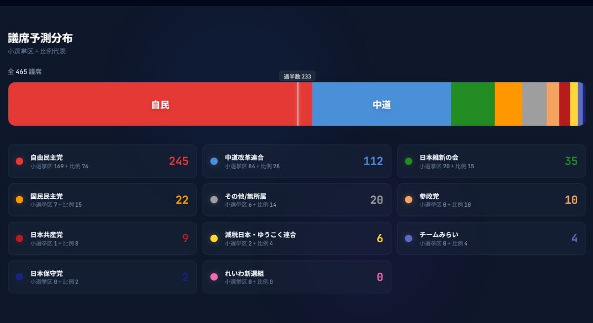 ホリエモンAI衆院選議席予測。自民245、中道112、維新35、国民22、参政10、共産9、減ゆ6、チみ4、保守2、れ0