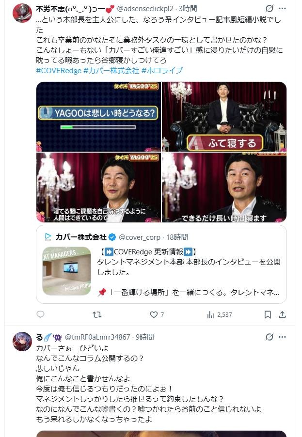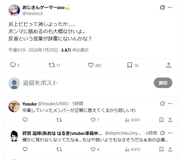 弱男が勝手に自分にはカバーという企業の後ろ盾あると勘違いして開示棒振り回してるの情けなくて哀れな弱男の成れの果てって感じ