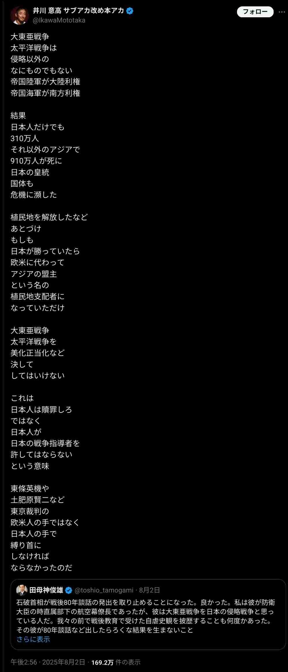 井川意高「大東亜戦争は侵略戦争。植民地の解放なんて後付け」