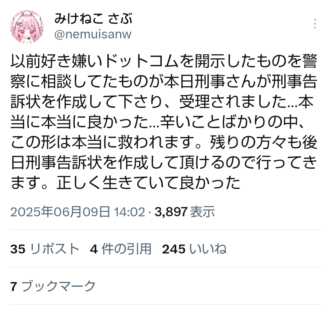 人気VTuberみけねこさん、誹謗中傷を繰り返す好き嫌いモメンを刑事告訴 震えて眠れ