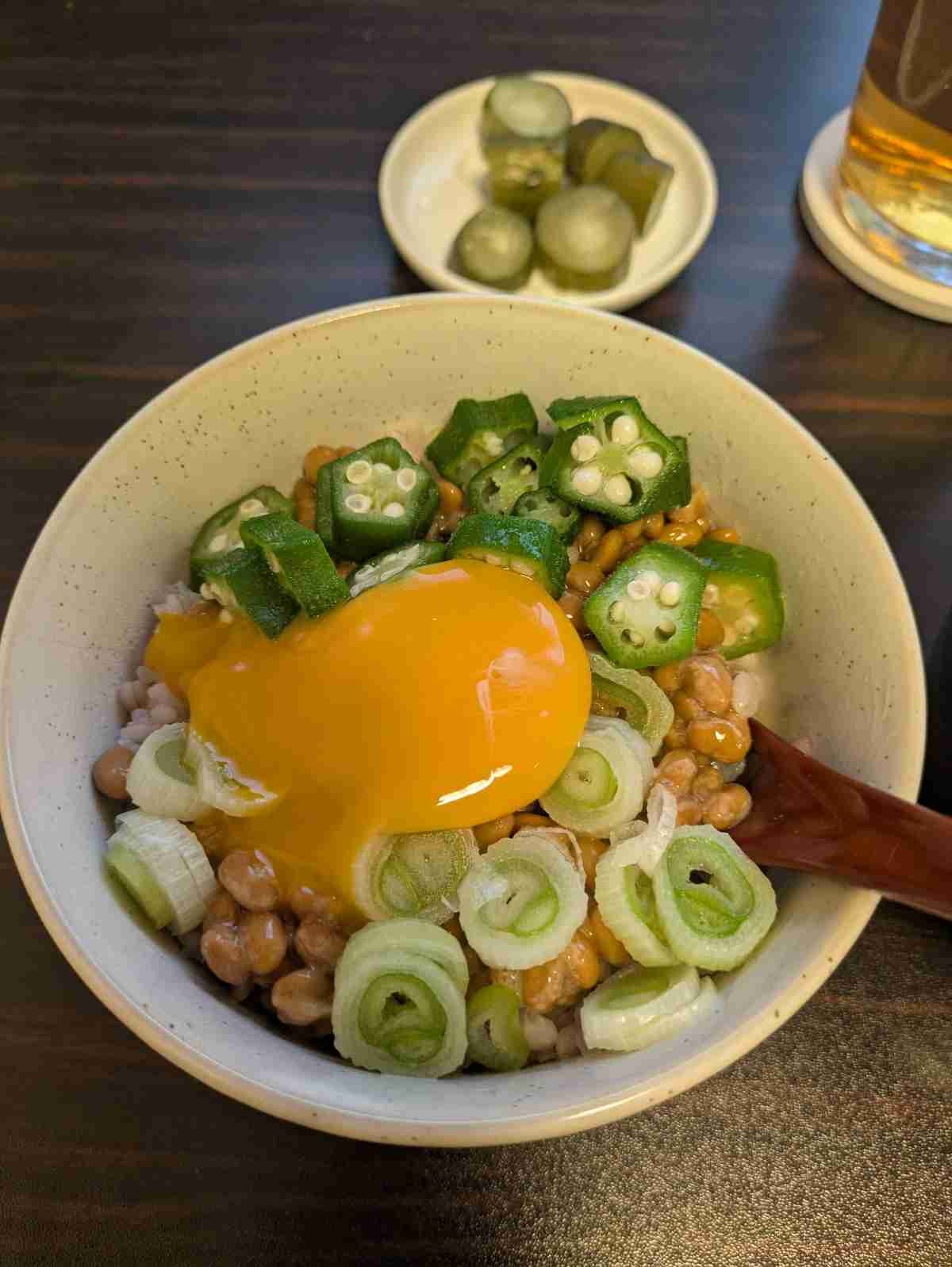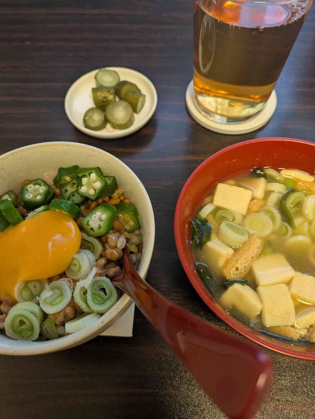 納豆オクラネギ卵のネバネバ丼とアチアチ具だくさん味噌汁だし、