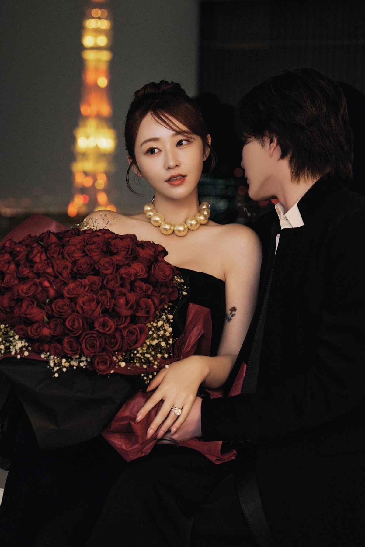 深紅のバラの花束を抱えたツーショット写真や、左手薬指の結婚指輪の写真なども公開した。