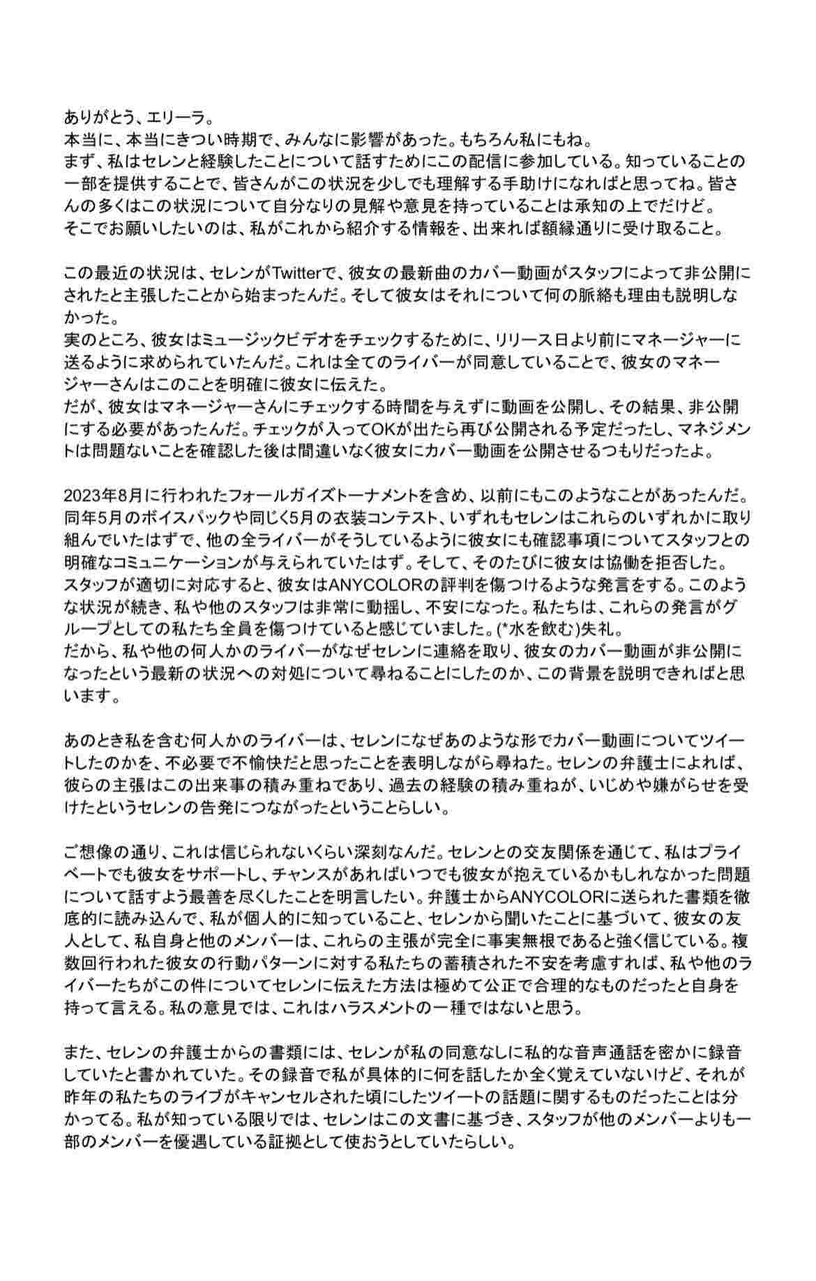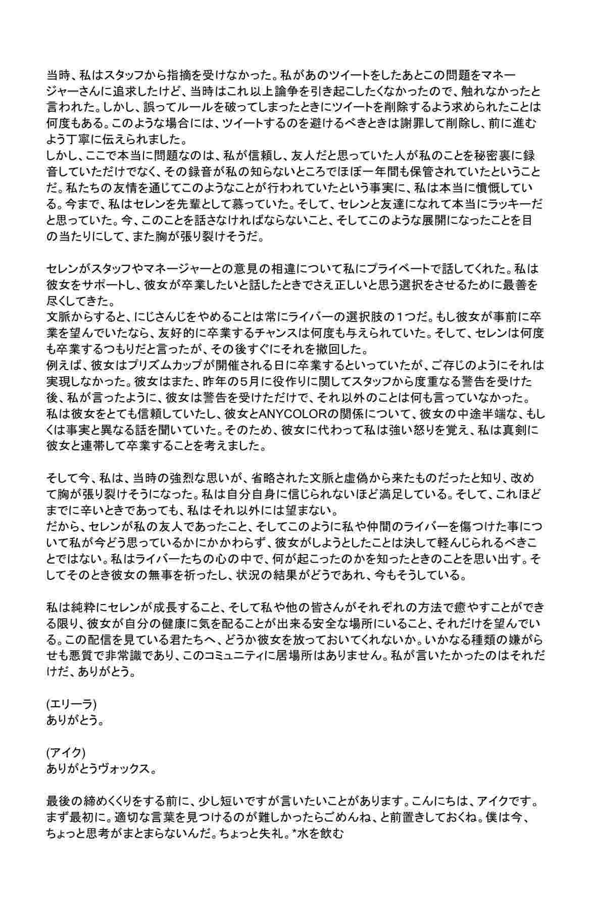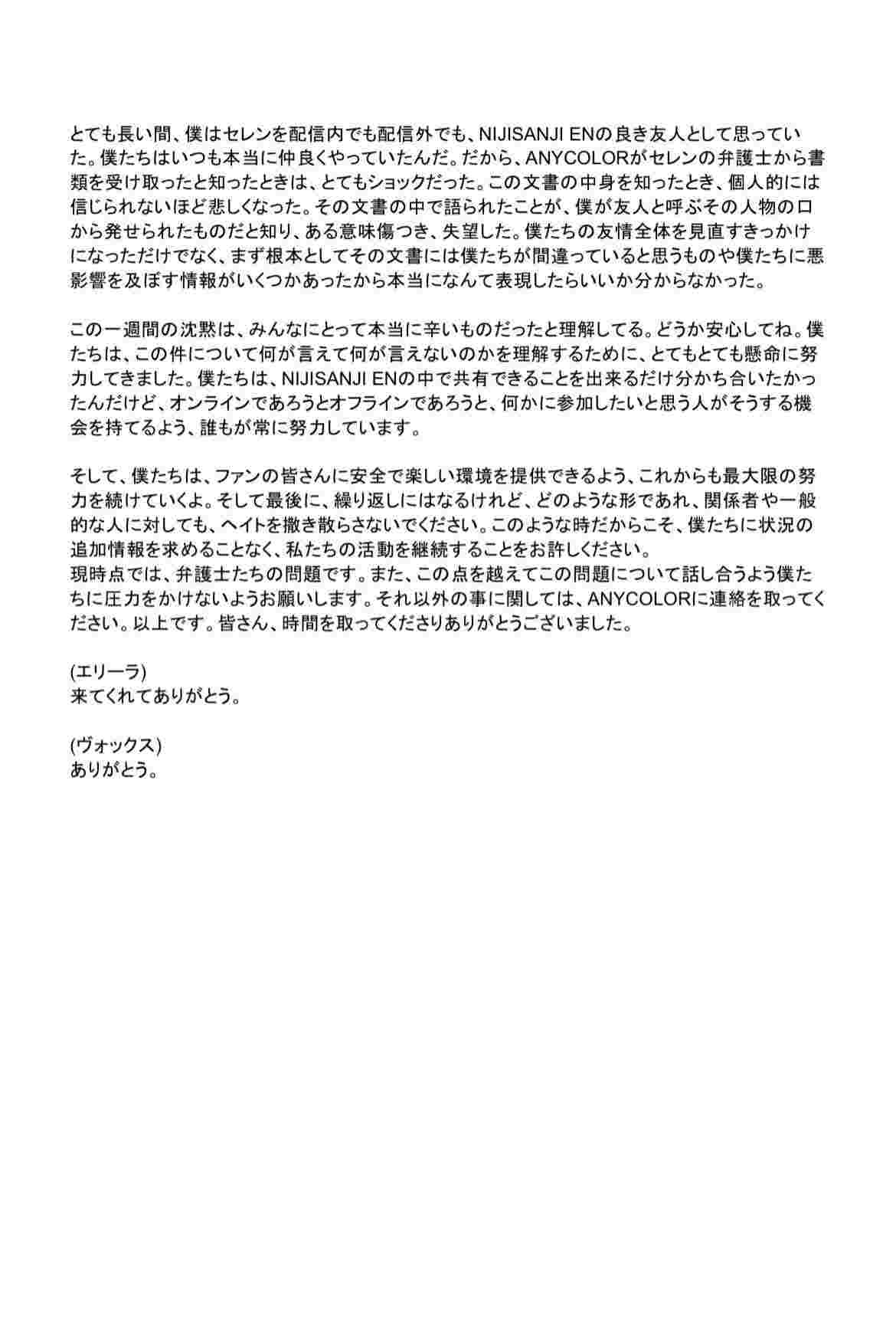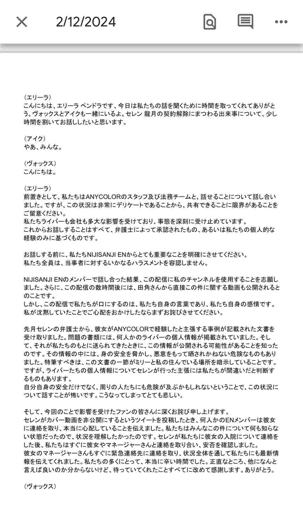 2024年ににじさんじENに所属していたセレン龍月の告発を発端とした炎上のさい、運営の矢面に立って配信で状況説明をした同僚のヴォックス、エリーラ、アイクの三人