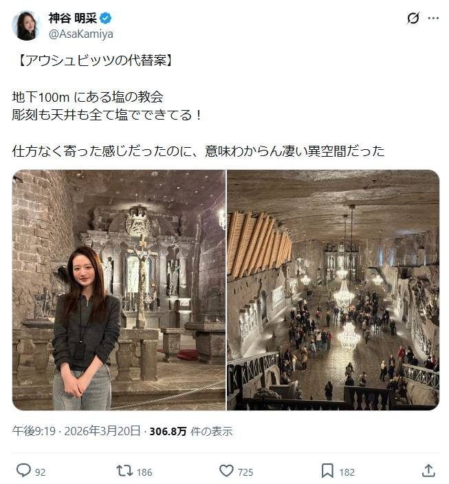 神谷は現在ポーランドを旅行中らしく、問題となったのは、3月20日に投稿した内容です。「【アウシュビッツの代替案】」と書き出し、「地下100mにある塩の教会 彫刻も天井も全て塩でできてる!」「仕方なく寄った感じだったのに、意味わからん凄い異空間だった」と、訪問先の感想をつづりました。