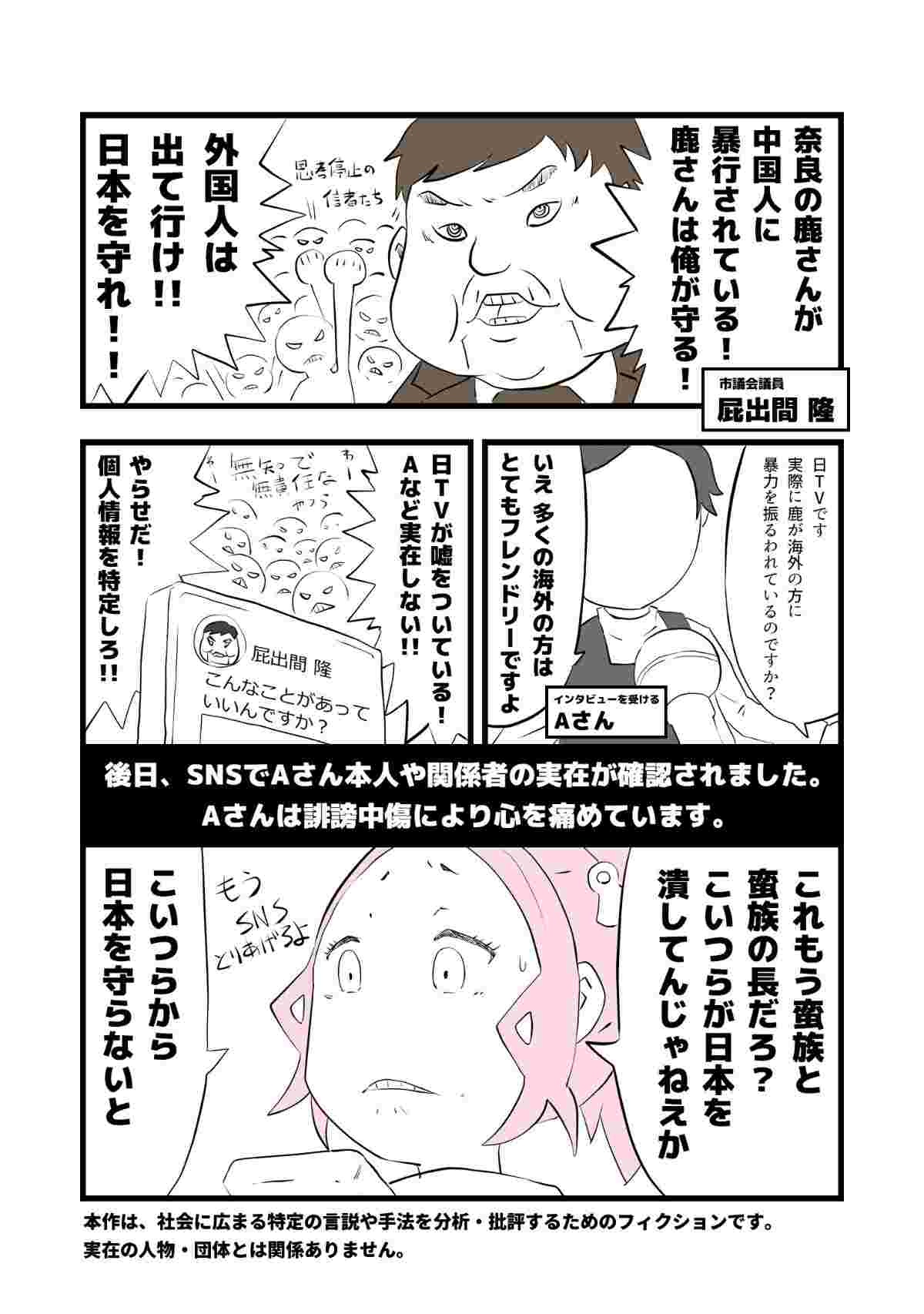 23、インタビューに答えている市民が、ヤラセや劇団員ではないかとデマが飛び交っている中、まだ調査途中であるのにもかかわらず、「本日は奈良公園の現地にてバスガイド、バスの運転手、売店のおばちゃん、たくさんの方々に取材をしました。残念ながら誰も知りませんでした。」「フォロー拡散で応援よろしくお願いします。」とデマを後押しするような情報を拡散する。(後にその市民は実在しており、ヤラセや劇団員ではないことが証明された。)