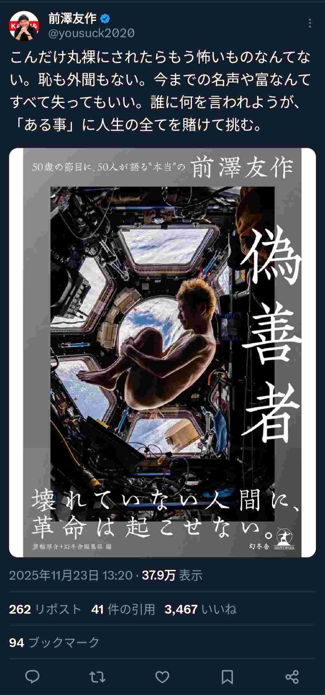 衣類通販大手ZOZOの創業者で、株式会社カブ&ピース代表取締役社長の前澤友作氏(49)が22日、X(旧ツイッター)を更新。50歳の節目を迎えて来月発売する著書「偽善者」をめぐり、思いをつづった。