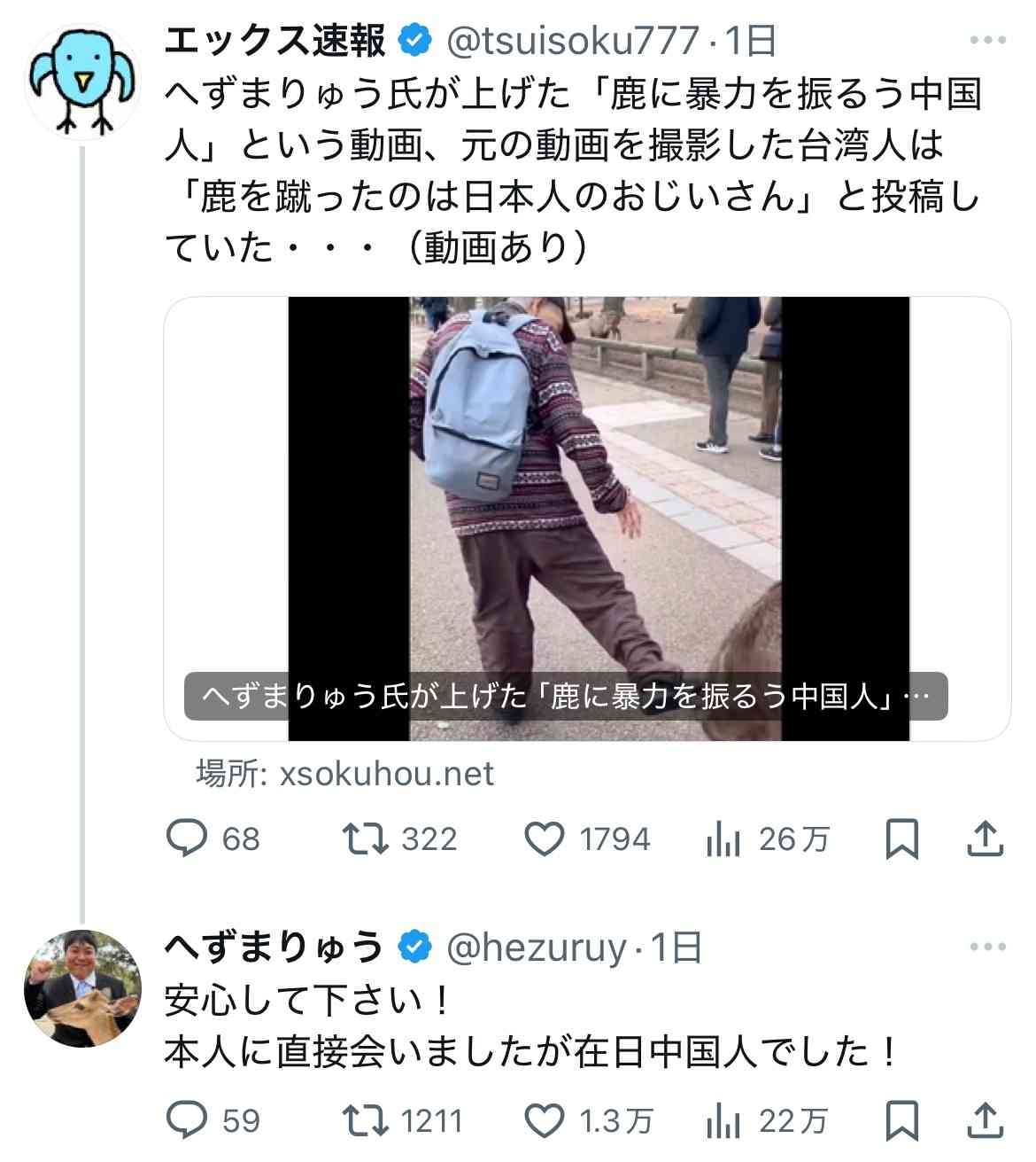 台湾人「鹿を蹴ったのは日本人」へずまりゅう「安心してください!本人に直接会いましたが在日中国人でした!」