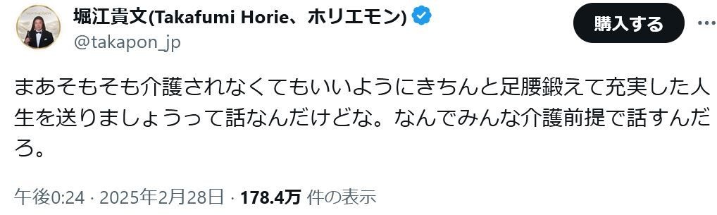 ホリエモンさんの言ってる事自体は間違ってるとまでは思わないけど、人間の個体差って大きいから要介護になる時はなるわけで、