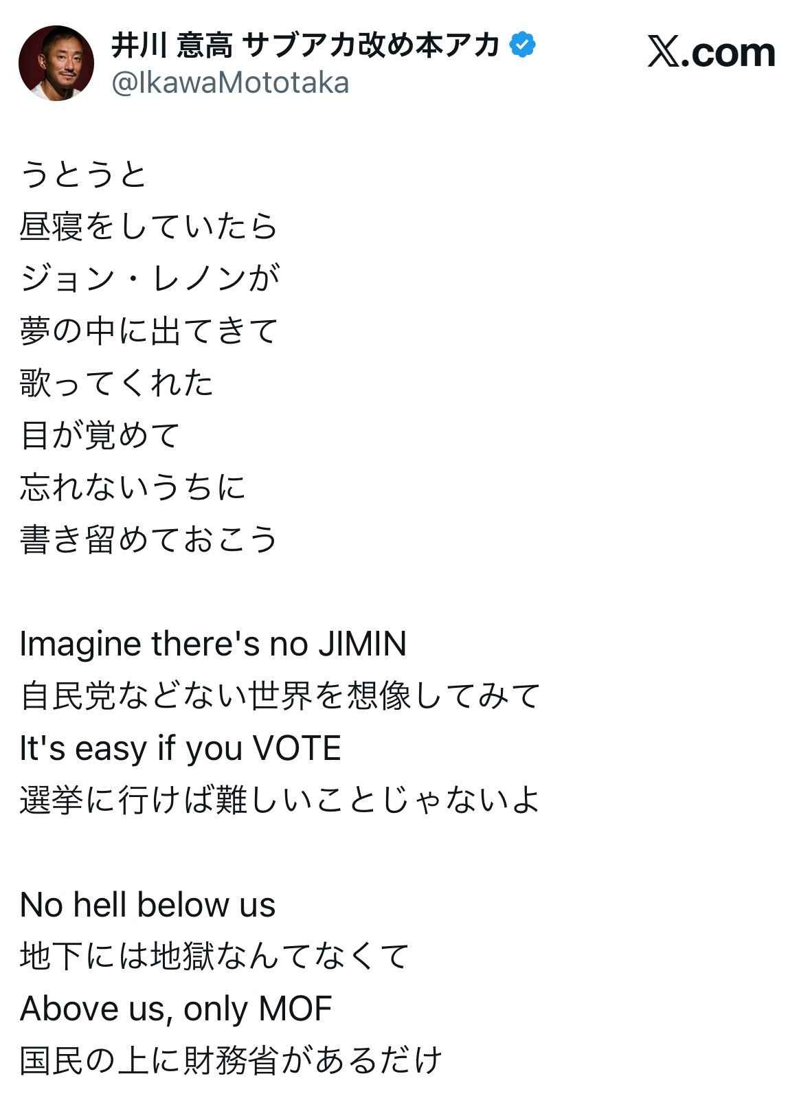 ジョン・レノンが夢で歌ってくれた自作ポエム、元会長の頭の中ではどんな壮大な世界が広がってるのか、凡人には想像もつかない話だ