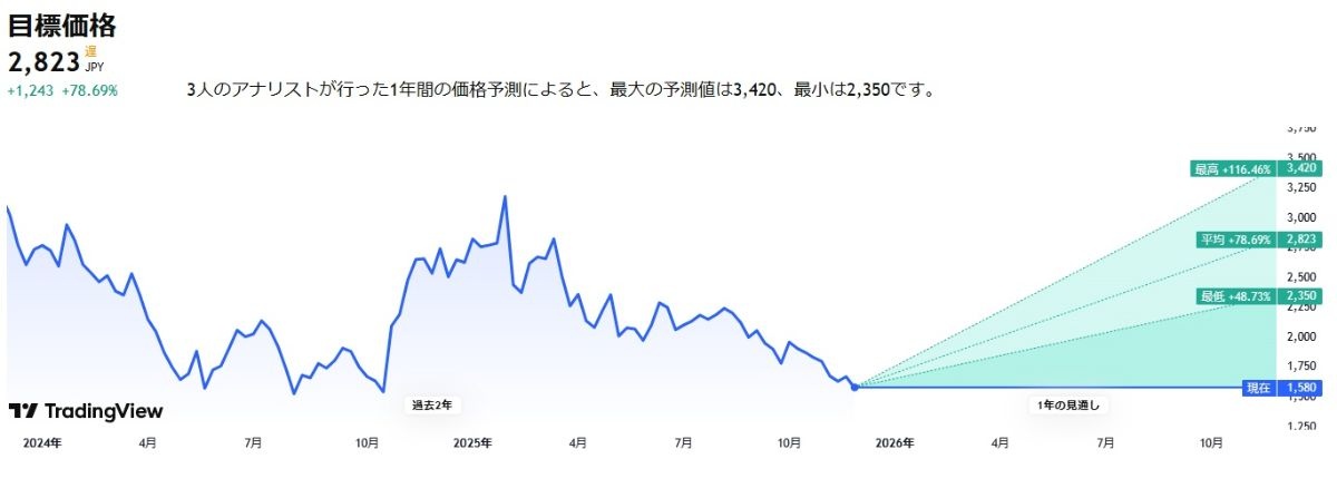 2025/12/03時点における、カバーに対する、アナリスト判断(コンセンサス)は、買い。内訳は、買い1人、中立1人となっています。アナリストの平均目標株価は2,950円で、株価はあと86.70%上昇すると予想しています。 カバー (5253) : アナリストの予想株価・プロ予想 [COVER] - みんかぶ2025/12/03-カバー(5253)のアナリスト予想。現在は【買い】(予想株価2,950円)と判断されています。プロの証券アナリストによる売買予想・予想株価を掲載しています。「2026年の業績予想」では、証券アナリストによる業績予想を掲載しています。minkabu.jp