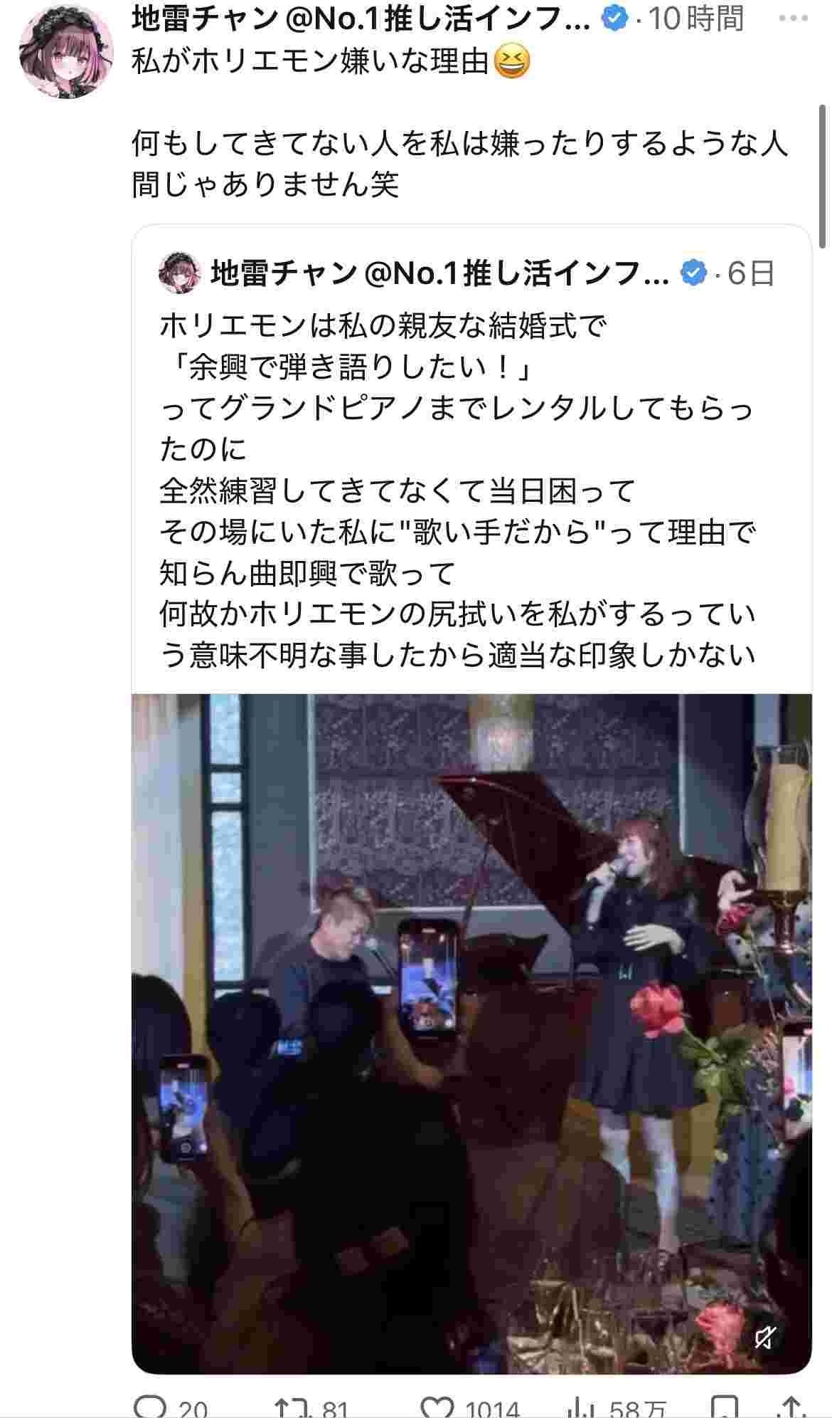そういう個人的なことをバラすのはひどいだろと思ったけど結婚式でホリエモンがやったのも相当ひどいから仕方ないわ