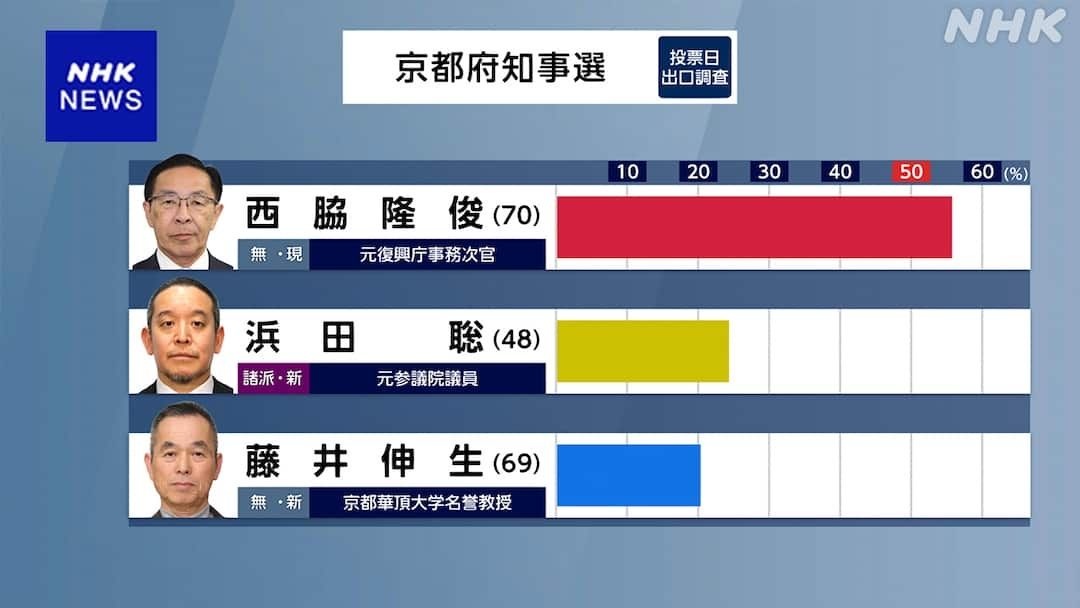 #選挙・京都京都府知事選は5日、投票され、現職の西脇隆俊氏(70)(無=自民・中道・国民・立民・公明推薦)が新人2人を破り、3選を確実にした。