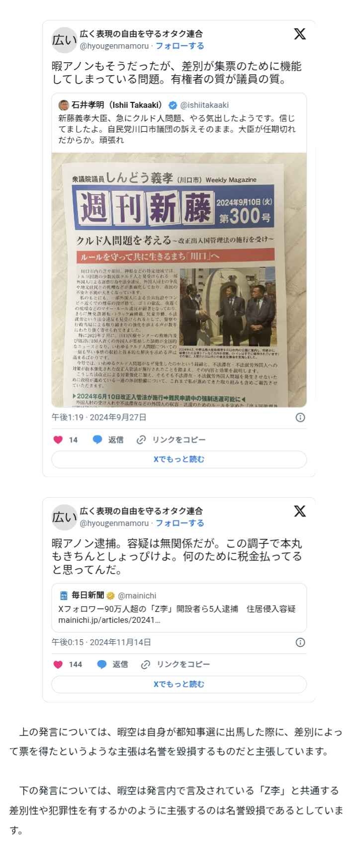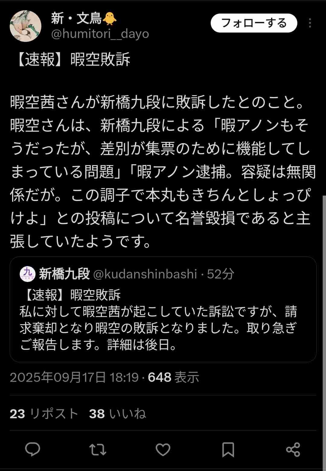 暇空茜さんが新橋九段に敗訴したとのこと。暇空さんは、新橋九段による「暇アノンもそうだったが、差別が集票のために機能してしまっている問題」「暇アノン逮捕。容疑は無関係だが。この調子で本丸もきちんとしょっぴけよ」との投稿について名誉毀損であると主張していたようです。