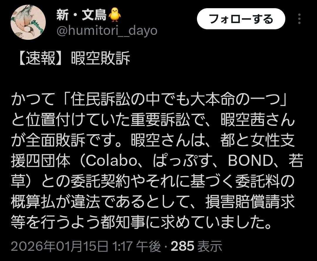 暇空茜、また敗訴🥸大本命としていたcolaboら4団体への損害賠償請求を求めた住民訴訟で