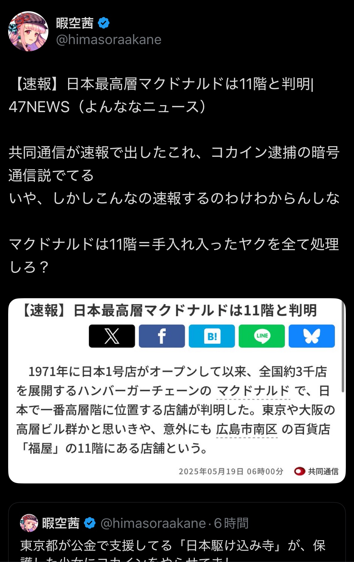 その半日ぐらい前に共同通信で日本最高層のマクドナルドは11階というニュースがあった暇空の中で何故かこれらが繋がり