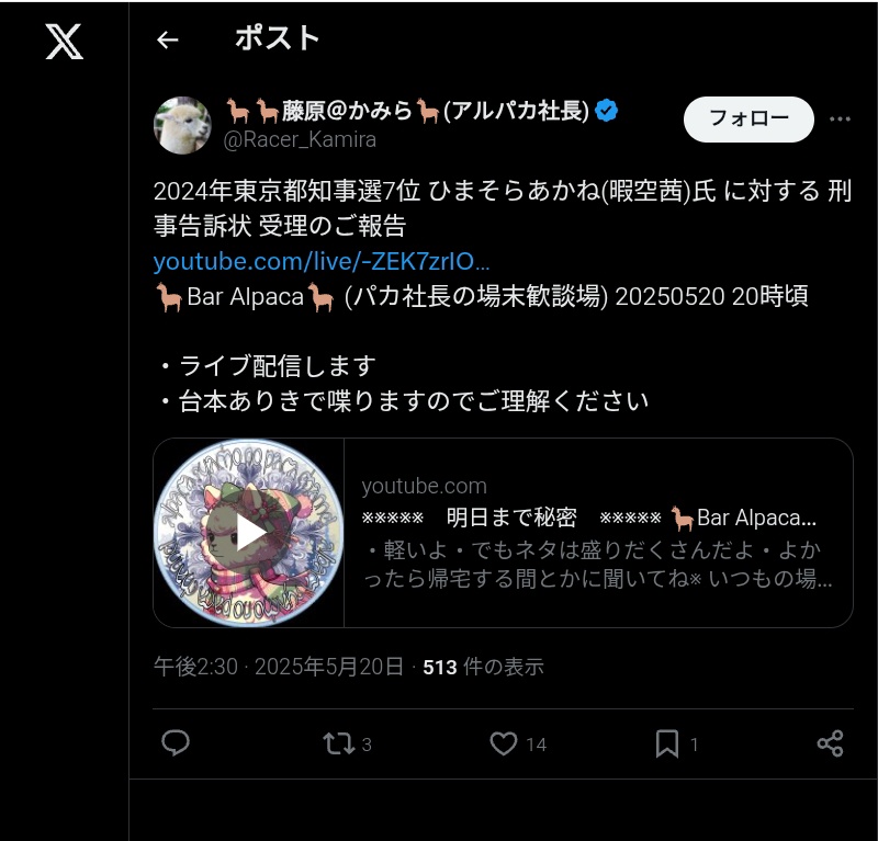 アルパカが暇空さんを警察に訴えて受理されたように見えるんだが - 139 : 2025/05/20(火) 15:05:20.64 ID:gYEyjtwS0